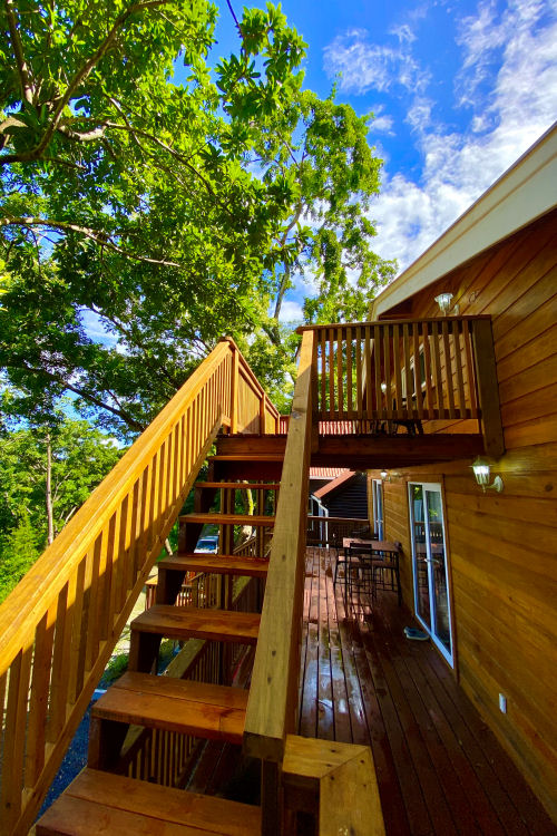 There is an upper and lower deck in the front and a full deck in the back of the house. There is ample parking under the house.